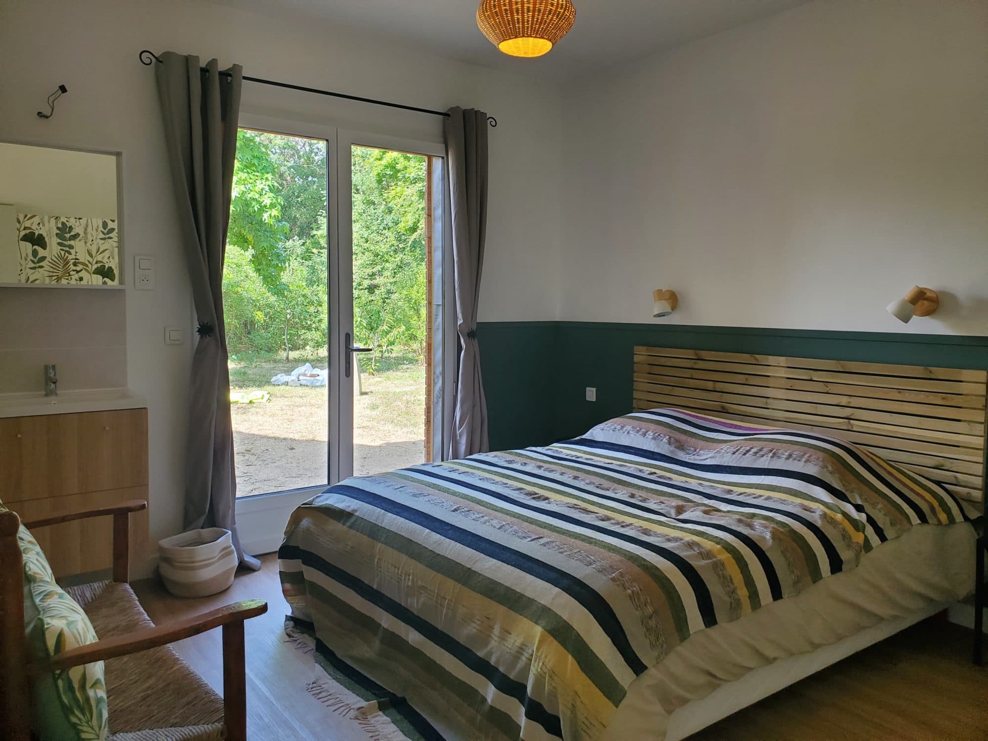 Depuis la chambre et le séjour, vous avez accès à un jardin privatif et au parc de 2 hectares (étangs, micro-ferme, espaces de jeux).